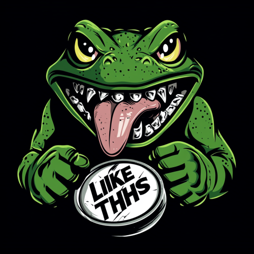 a logo for a hockey team with a fierce green frog with its tongue out holding an ice hockey puck that says LICK THIS. The frog has teeth that have been knocked out and a black eye. The frog is mean looking.