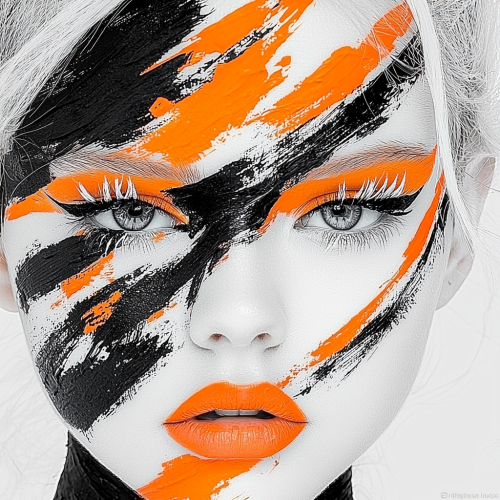 close up, model wearing new makeup style named flying fox, exaggerate white eye lashes, glowing neon orange eye shadow, chacoal black eye liner drawing perfect curves like upward wings of pheonix, charming and cool appearance, fantasy + mysterious vibe, editorial style, detailed photography, 1/1000 second shutter speed, high definition --chaos 50 --ar 1:1 --quality 2 --style raw --personalize 7vdryyo --stylize 1000 --v 6.1