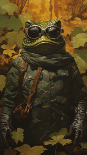 frog hunter with a eye patch made of leaves, 1970's dark fantasy --ar 9:16