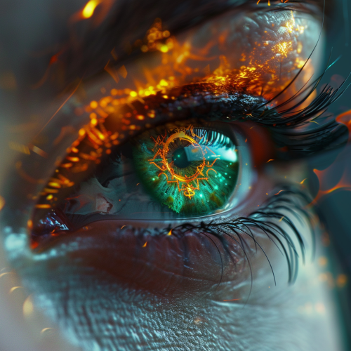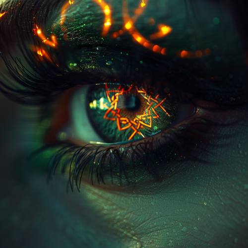 intense female celtic green cyber eye, vibrant color, long eye lashes, stunning makeup, flames, celtic symbol, photo realistic, 4k high definition --s 250
