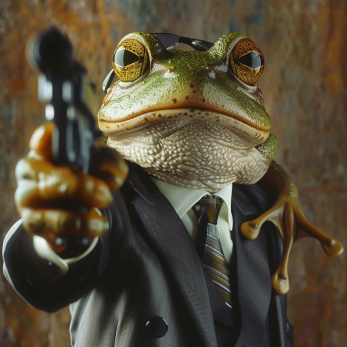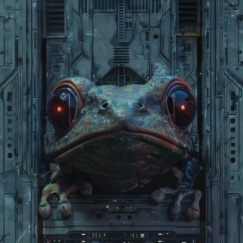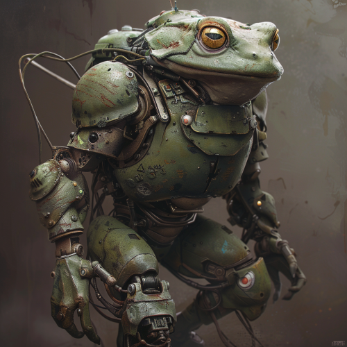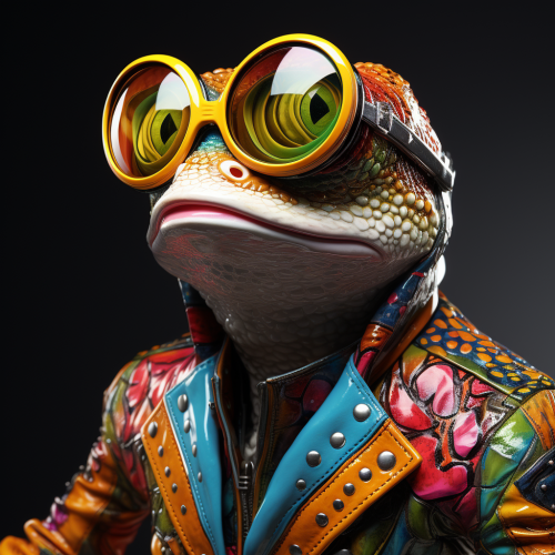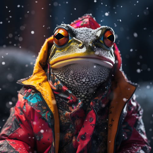 Create and NFT of a Portrait of a futurist Frog animal in a colorful rubber suit in a snow storm . 8k. Cinematographic --s 250