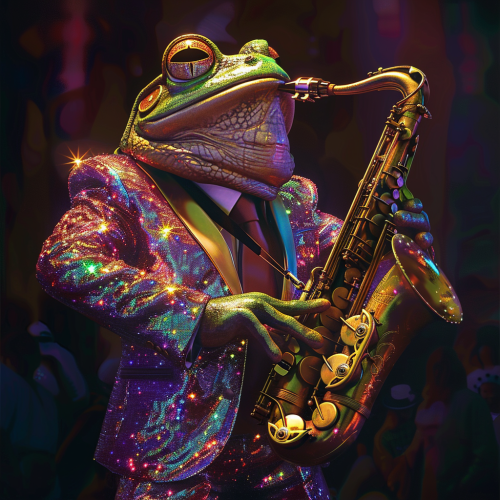 a color image in cartoon style of a male frog dressed in bright sequined suit playing a saxophone in a club--ar 9.11
