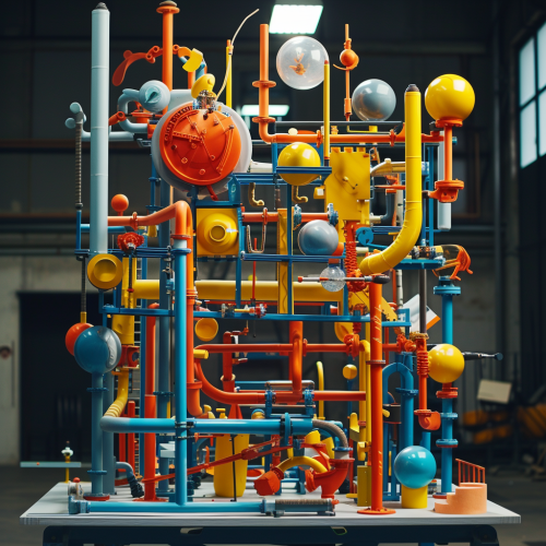 a huge bright Rube Goldberg machine of pipes and a single ball. The end result is dropping the ball into the trash --v 6.0 --style raw