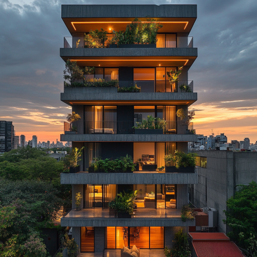 front view of 8 Levels contemporary modern building with the penthouse on the top. width of the building is 22meters wide. on the ground floor there are some plants on the left side and entrace on right side. there are 2 house unit in each floor. so 2 balcony comes out in facade of the building. there are also some plants on the top floor, penthouse.