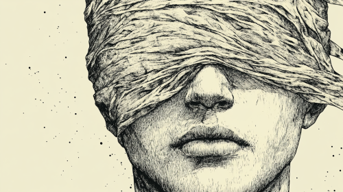 An ink art style illustration of a person's face, with their eyes covered by a cloth. The image should convey deep emotions through the expression of the face, highlighting feelings of confusion or vulnerability. Use intricate ink detailing to emphasize the texture of the cloth and the contours of the face. The background should be minimalistic to draw attention to the subject. Focus on creating a powerful visual impact with contrasting ink shades. --ar 16:9