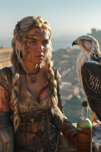 gorgeous stunning female elf with golden blonde hair in a braid, she is lounging on a rooftop with a bottle of rum, there is a beautiful white hawk perched next to her, mud and dirt smears on her clothes and face, background is a view of a Moroccan city, glowing skin, plump lips, black assassin’s armor in the style of Assassin’s Creed, Full scale, full body, wide angle, romantic, dreamy, ethereal, Cinematic, Photoshoot, Shot on 35mm lens, Depth of Field, DOF, Tilt blur, Shutter speed 1/1000, F/22, White balance, 32k, Super-resulution, Megapixel, Pro Photo RGB, VR, Lonely, Good, Massive, Half rear Lighting, Backlight, Dramatic Lighting, Incandescent, Optical Fiber, Moody Lighting, Cinematic Lighting, Studio Lighting, Soft Lighting, Volumetric, Conte-Jour, Beatiful Lighting, Accent Lighting, Global Illuminating, Screen space Global illuminating, Ray Tracing Global Illuminating, Optics, Scattering, Glowing, Shadows, Rough, Shimmering, Ray tracing reflections, Lumen Reflections, Screen space reflections, Diffraction grading, Chromatic Aberration, GB Displacement, Scan lines, Ray traced, ray traceing Ambient occlusion, Anti aliasing, FKAA, TXAA, RTX, SSAO, Shaders, Open-GL Shaders, GLSL-Shaders, Post Processing, Post Production, Cell Shading, Tone Mapping, CGI, VFX, SFX, insanely detailed and intricate, hyper maximalist, elegant, super detailed, dynamic pose, photography, volumetric, ultra-detailed, intricate detailes, 8K, super detailed, ambient --ar 2:3 --v 6.0