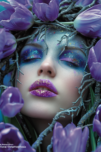 a floral Metamorphosis Concept: "Floral Metamorphosis" is a symbolic and abstract representation of a woman's face transforming, blending elements of nature and surrealism. The artwork portrays the woman's inner beauty and strength, symbolized by the rooted tree hair while celebrating her multi-faceted identity with rainbow lips. Purple tulips, known for their symbolism of admiration and enchantment, frame her face, adding a touch of elegance and mystique. Composition: Face: The woman's face is rendered in an abstract, cubist-inspired style reminiscent of Picasso's work. The facial features are fragmented, creating an intriguing interplay of shapes and forms. The use of cool and soothing colors like blues and purples accentuates the surreal atmosphere. Purple Tulips: Surrounding the woman's face are vibrant purple tulips, their petals curving and twisting in a harmonious dance with the contours of her visage. These tulips symbolize the admiration and enchantment that the viewer experiences when gazing upon her. Rainbow Lips: The woman's lips are the focal point of the artwork. They are painted in a mesmerizing rainbow of colors, representing her diverse and multifaceted identity. The lips exude confidence and individuality, challenging conventional beauty standards. Rooted Tree Hair: Emerging from the top of her head, the woman's hair takes on the appearance of a rooted tree. The tree's branches and roots intertwine with her hair, symbolizing her strength, resilience, and connection to nature. The roots extend downward, grounding her in her identity and values. Interactivity: To enhance viewer engagement, the artwork can incorporate subtle, shifting LED lights that illuminate the tulips and the rainbow lips, creating a dynamic interplay of colors. As viewers [...]