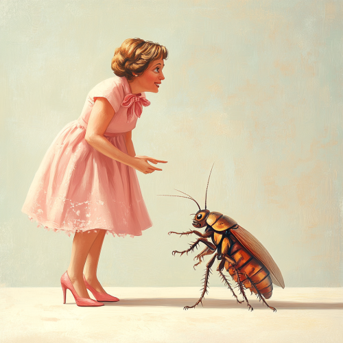 Woman with short hair, plump, 40 years old, white, talking to a cockroach of the same size wearing a pink dress, ribbon bow and high heel shoes for a children's book