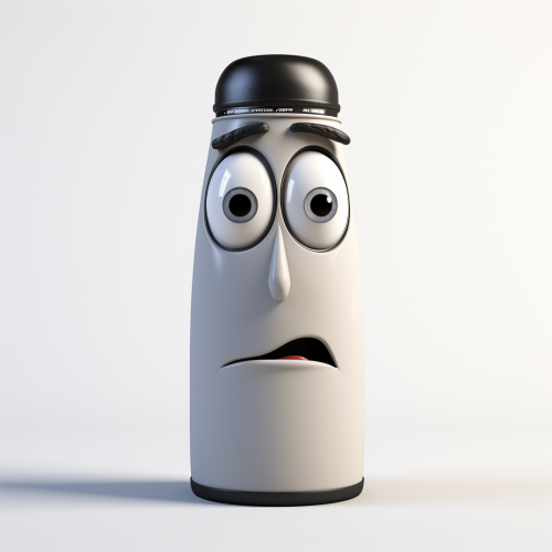 a pixar style animation of a frowning male head made of a Stanley thermos with a white background