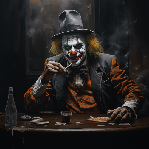 Gangster Clown Hyperrealistic, Gangster, Clown, Smoking a Cigar, Shot of whiskey