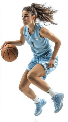An Argentinian female basketball team player, light blue outfit with little dark blue details. In motion, side view, no background --aspect 9:16 --style raw