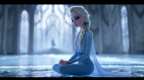 Capture Elsa (Frozen) in a front-facing view as she meditates in a grand room of ice, in a high-budget 3D animation style akin to the most elaborate Disney productions. Elsa directly facing the viewer, with her eyes gently closed, and a peaceful expression on her face. She is seated cross-legged on the shimmering ice floor, with her hands resting on her knees in a classic meditation pose. Her iconic, long-sleeved blue gown with detailed snowflake patterns, her pale skin as white as snow, her striking azure blue eyes, and platinum blonde hair in a braid over her shoulder must be depicted with precise detail, faithfully reflecting the original image provided. The ambient light illuminates her serene face, ensuring that her front view is the focal point, with a 100% resemblance to her original portrayal. --ar 16:9 --v 6.0