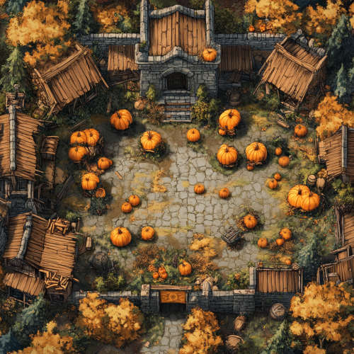 a top down dungeons and dragons battle map, a village square, it is decorated with Jack o' lanterns and straw effigies, harvest festival, dungeons and dragons map