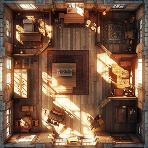 a birds eye view battle map for dungeons and dragons, the map is off an old castle office with wooden floors, a desk, an animal rug, and various bits that would be found in a castle are there