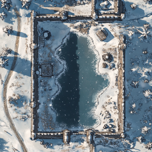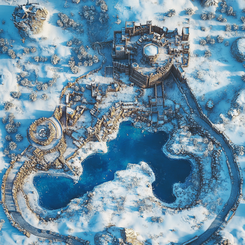 table top gaming map, no grid, winter setting, Large open space with city walls on the right next to a large open tundra, frozen lake to the north, overtop view, No trees, a road runs between the walls and the lake,