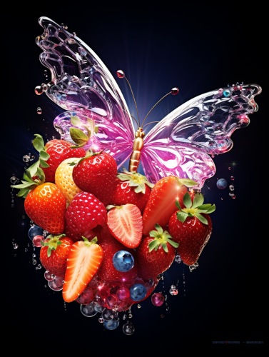 A 3D photo of a grapes, blueberry, cut of pine apple ,splash of passion fruit in minimal style, no background