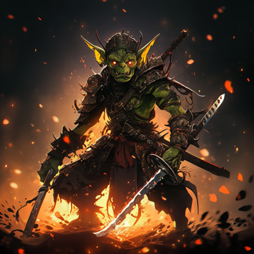 Grimdark mystic amazing enhanced goblin ronin champion, full body, anime style, ronin outfit, enhanced equipment, high fantasy, digital art, masterpiece painting, ultra detailed, ultra high definition, 8K resolution, heavy shading, superior quality, cover illustration, complex design, luminous highlights, rich vibrant colours, hyperrealistic, meticulously hyper detailed, high contrast, artstation --niji 5