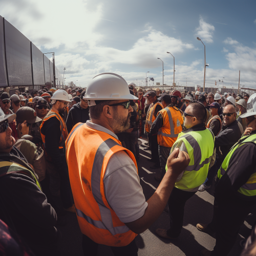crowd of angry construction workers at a security checkpoint, photo