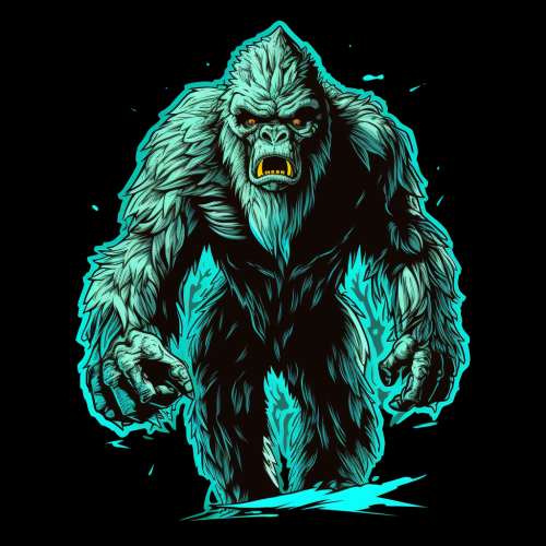 Bigfoot illustration for a sticker with black background, in the style of bold outline, jagged edges, trashcore, luminous shadowing