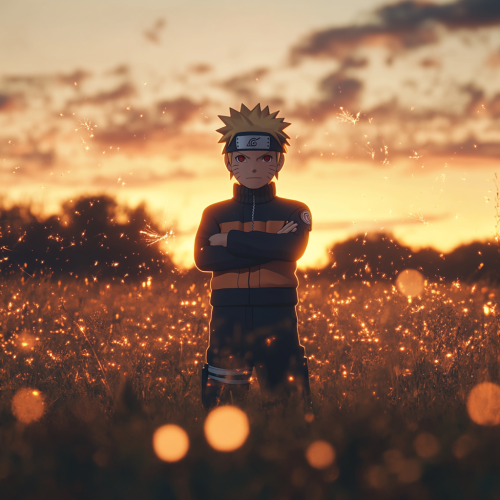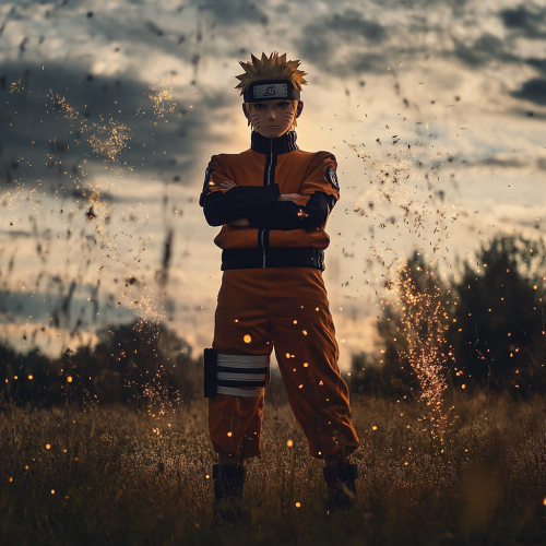 full body image of Naruto standing with his arms folded in the middle of a field, sparks in the background shot with a Song A7R IV and a high-resolution 35mm wide-angle lens, ultra realistic, live action