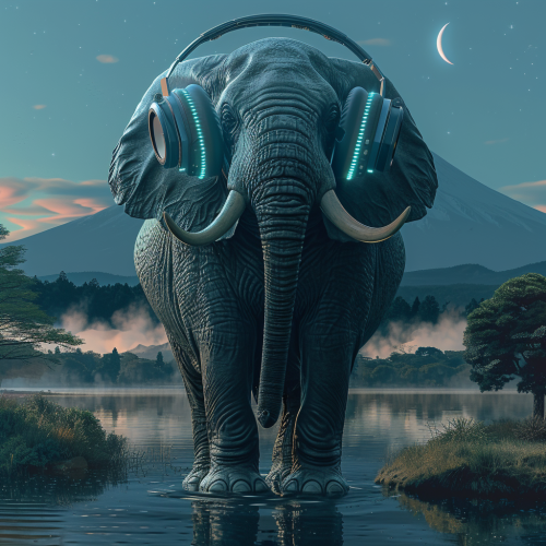 single Massive African grey elephant wearing massive over ear nuclear powered headphones. Headphones are very wide and almost the same size of the elephant’s head. Small white LEDs on headphones. Little steam coming from small vents on lower portion of headphones. Green African savanna. Near lake. Distant massive mountain, massive full moonrise. Green Japanese maple. Photorealistic, ultra-realistic, cinematic --v 6.0