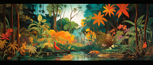 herbivore flora in lilac purple with plam trees and tropical birds, in the style of light orange and magenta, the aesthetic movement, elaborate textiles, wallpaper, colorful drawings, yellow and pink, rusticcore --ar 50:47 --v 6.0 --tile