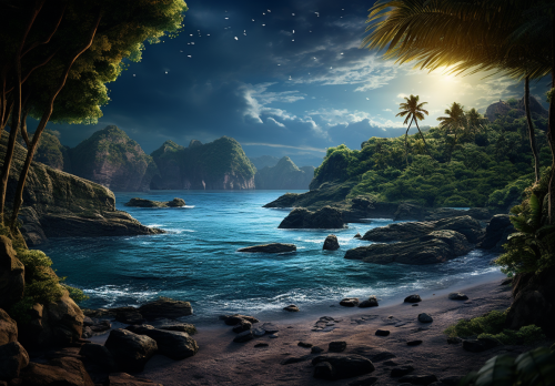 National Geographic shot of a lush and verdant tropical landscape overlooking the ocean and two moons, realistic textures for depth of field, gorgeous and eye catching image, --ar 6500:4500 --s 250
