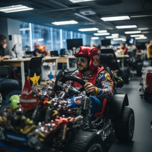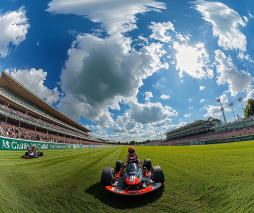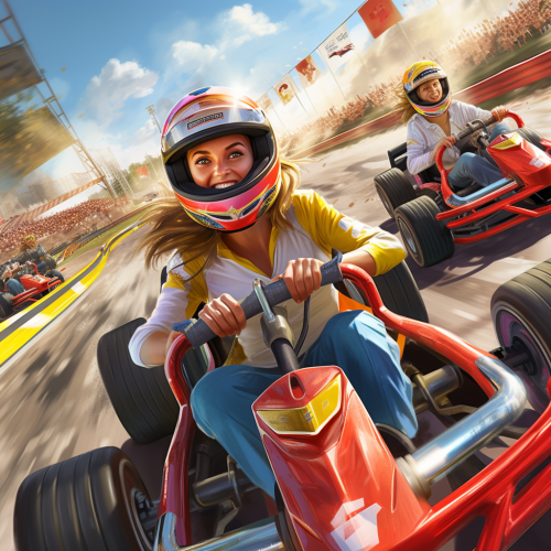 photorealistic image of people racing go-karts on an outdoor track. The scene should be vibrant and dynamic, capturing the excitement and speed of go-kart racing. The main focus is a diverse group of racers, each with distinct features, expressions, and racing suits. One racer, a young woman with curly blonde hair, should be in the lead, her expression a mix of concentration and thrill. The go-karts are modern and colorful, with sleek designs that suggest speed and agility. The track should be well-defined with clear lanes, surrounded by safety barriers and enthusiastic spectators in the background. The setting is a bright, sunny day with a few clouds, creating a contrast of light and shadow across the track, enhancing the sense of movement and action. The image should capture a pivotal moment in the race, perhaps a tight turn or a close competition between the racers. Use a high-end camera setup like a Sony A7R IV or Canon EOS R5, with settings that freeze the action while maintaining clarity and vibrant colors. Camera settings: ISO 200, shutter speed 1/1000, aperture f/5.6. The composition should offer a wide view of the race, focusing on the racers and their interaction with the track, while also including the lively atmosphere of the event in the background