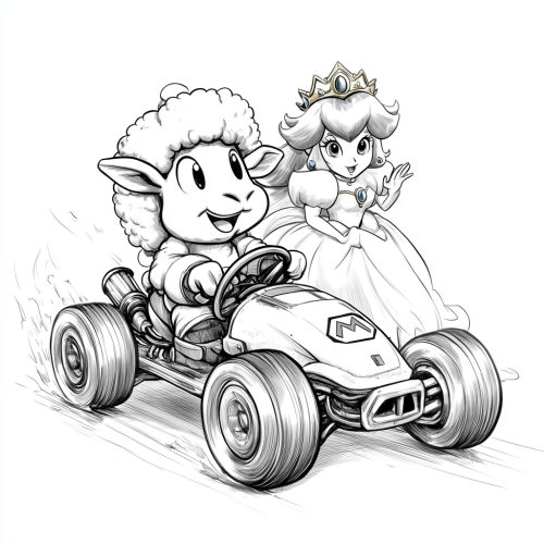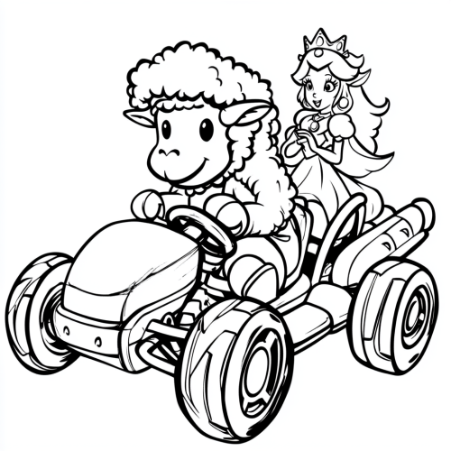 disney cartoon style, happy friendly sheep with four legs is driving in a mario kart against princess peach, standing sideways but looking into the camera, white background and black and white, for coloring