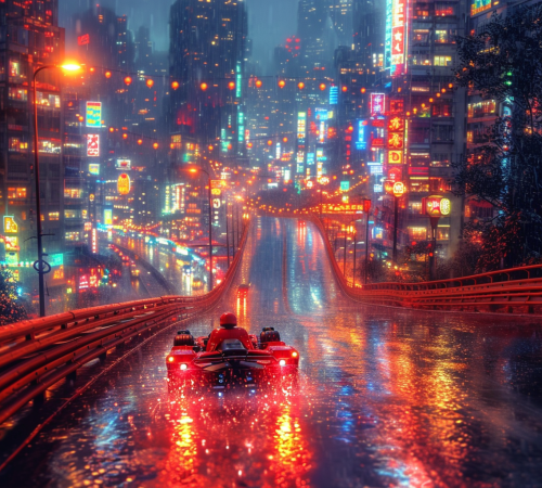 Black Go Kart track in the rain at night over skyscrapers with colorful lights,HD --v 6.0 --ar 21:19 --stylize 1000 --style raw