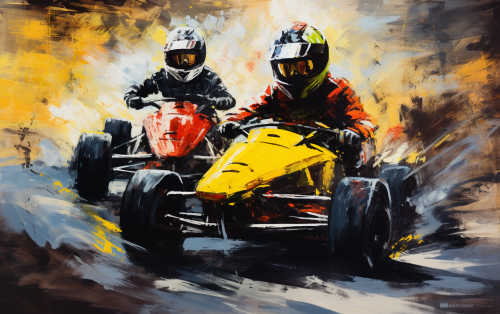 few black hood mens playing gokart racing, Bold brush stroke acrylic painting style , sunny day, acrylic touch --ar 8:5