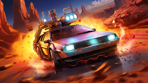 the delorean car from back to the future, racing through the mushroom kingdom track from Mario Kart. Artstyle pixar/nintendo style. --ar 16:9