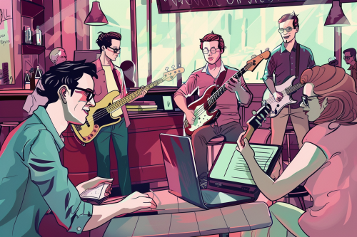 Cinematic still shot, style by Milo Manara, 4 Chimp dudes, stocky chimp playing the drums, tall chimp playing electric jazz bass, two chimp dudes in from playing acoustic guitars, performing onstage at bar, a smoky Halloween themed and colored setting - - AR 16:9