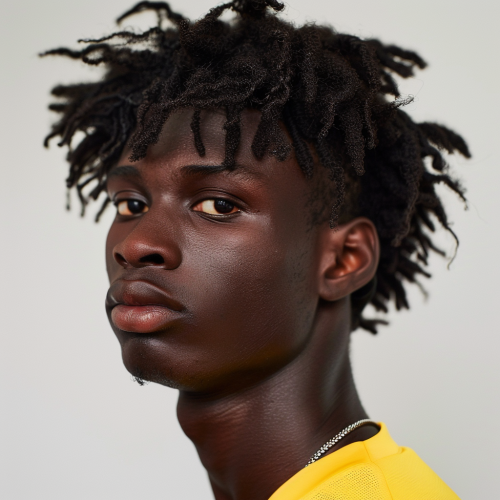 Portrait of an 18-year-old Black English-Nigerian football player with a strong, long neck. He has smooth, wet, long black hair styled in a mullet, but with curly, non-African-typed texture. The player faces the camera directly, showcasing high cheekbones and striking yellow, clear eyes. The skin is smooth and his expression is serious. The photo should be a professional football profile shot, with the neck clearly visible and no distractions in the background. Lighting should highlight his facial structure, with a focus on the clean, cut-out look used in football manager faces - white background plain portrait neck to head, european typed hair, smooth and curly, hair behind ears --v 6.0