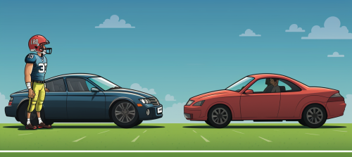 American football field, side view, car vs football player, facing off, cartoon-style --ar 9:4