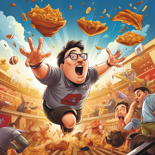 a cartoon depiction of an American football player leaping into a bowl of Chinese wontons. In the background is a packed stadium with a referee signaling touchdown.