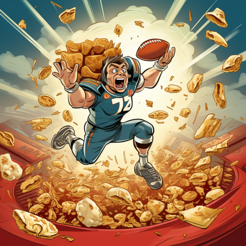 a cartoon depiction of an American football player, with helmet on, leaping into a giant bowl of Chinese dumplings