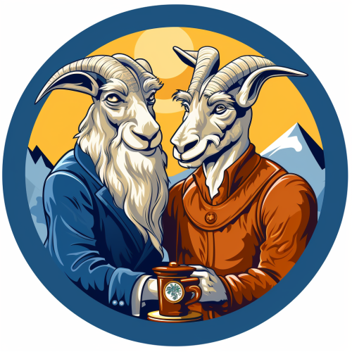 a funny cartoon logo of a woman being head butted by a goat, with a chicken.