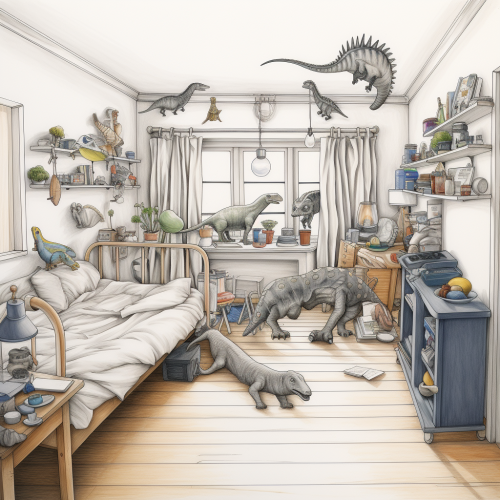A bedroom with twenty four dinosuar toys on the floor, single bed, window, simple pencil drawing. ar 16:9