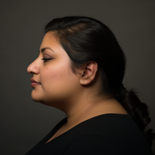 Real woman, age 35,mugshot, indian lady, big nose, double chin, round face, chubby. Right facing, profile shot, medium shot. Neutral face. Dark background. In a grocery shop. Polaroid --stylize 25 --v 5.2
