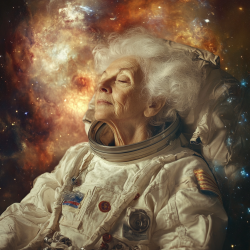 a beautiful anciana exploring the universe con asombro. En traje de astronauta . Imagen de cuerpo entero . Es feliz y está absorta en lo que ve. Imagen fotorrealista llena de detalles