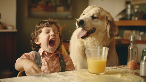 3-year-old boy slurps in high chair, drops some mash which dog enjoys licking it off high chair shelf. Mom surprises them as two friends in the tavern.... --ar 16:9