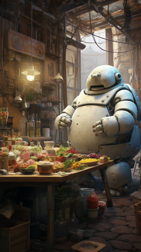 an old mediterranean fat lady and a robot in front of a table full of ingredients --ar 9:16