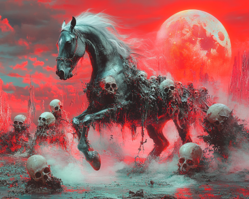 One funny and scary woman character in tight black tops with a pattern of human skulls, Halloween horror, on a black background, color illustration, bright saturated colors in CMYK, line art, 8k