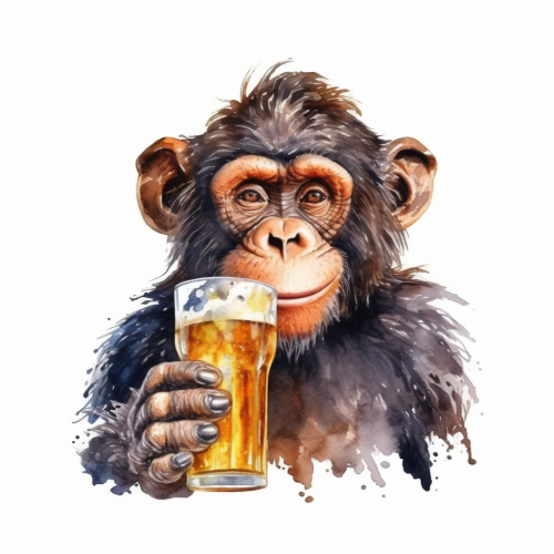 a funny Monkey with fresh beer. illustration for a shirt, black line, watercolor painting, white background, funny --v 5.1 --style raw