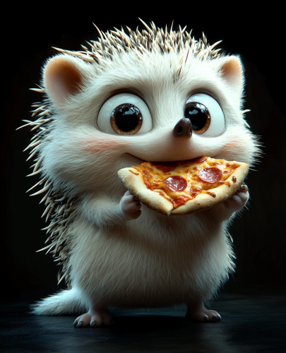 black background. a humorous white hedgehog with bulging eyes pulls a piece of pizza. Pixar engine, cartoon caricature design. --ar 179:220 --stylize 250 --v 6.1