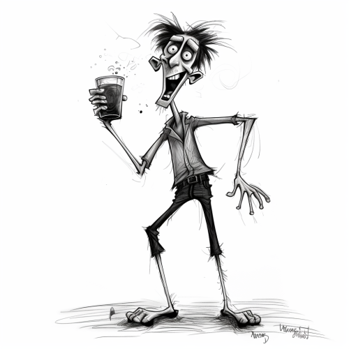 cartoon funny sketch in black and white of drunk skinny man sitting by the caravan
