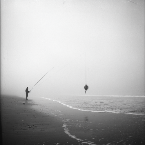 foggy beach at the back. early morning. dreamy white fog. man is holding fishing rod and at the end there is a blowfish hanging. black and white. cinematic . blurry .