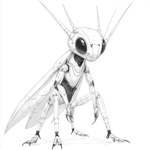 detailed illustration of a yellow mantis walking white sand tadanori yokoo, bright blue sky, birds in the distance, red stars, 3d, surreal, --chaos 6 --ar 3:4 --s 208 --v 6.1