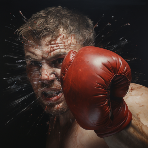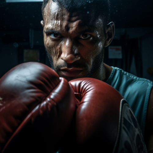 Low-angle shot focusing on the impact of a gloved fist against a boxing bag, capturing the tension in the muscles, face not in focus Lens: 50mm Aperture: f/2.8 Shutter Speed: 1/1000s ISO: 400